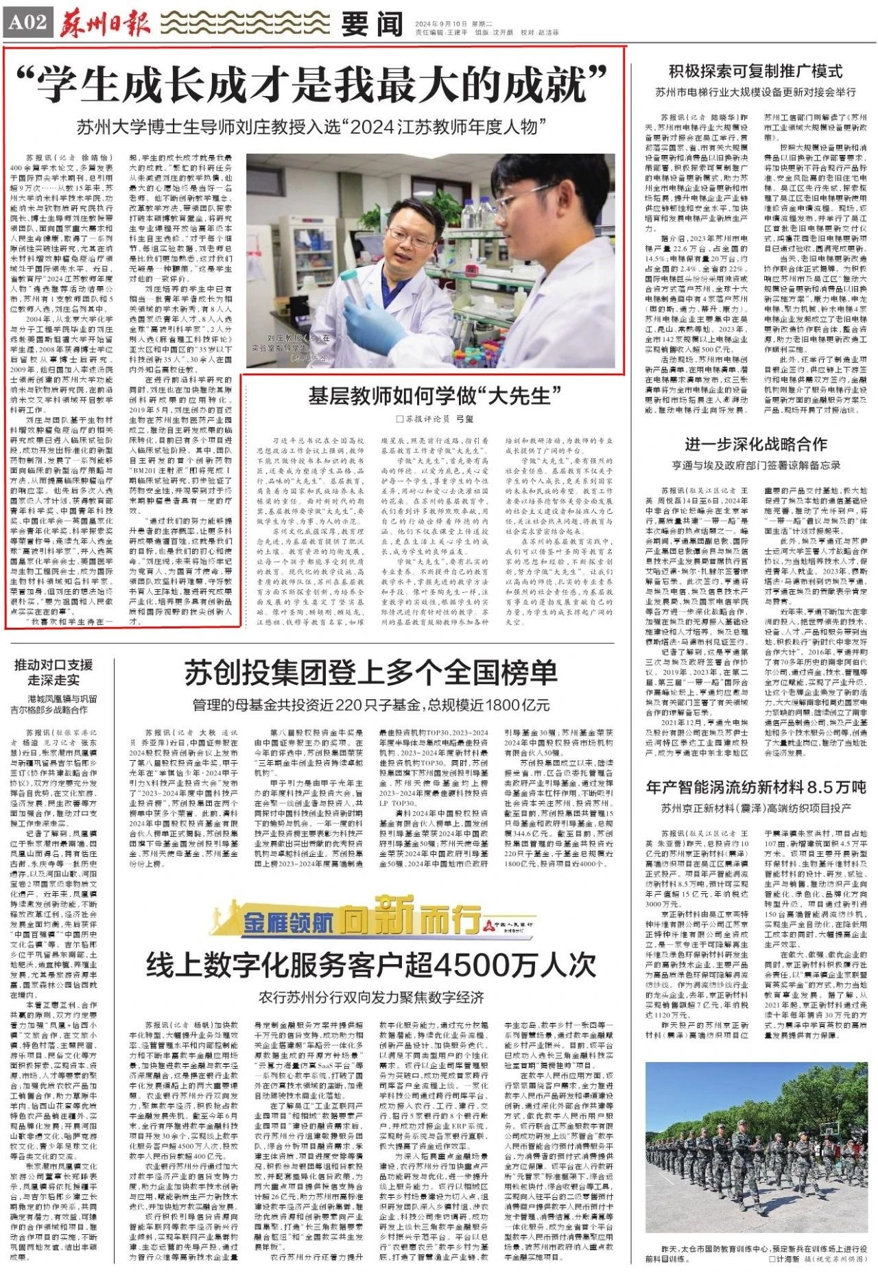 苏报讯(记者 徐靖怡)400余篇学术论文,多篇发表于国际顶尖学术期刊,总引用超9万次……从教15年来,苏州大学纳米科学技术学院、功能纳米与软物质研究院执行院长、博士生导师刘庄教授带领团队,面向国家重大需求和人民生命健康,取得了一系列原创性突破性研究,尤其在纳米材料增效肿瘤免疫治疗领域处于国际领先水平。近日,省教育厅“2024江苏教师年度人物”遴选推荐活动结果公布,苏州有1支教师团队和5位教师入选,刘庄名列其中。