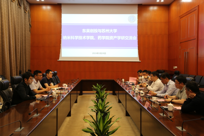 5月28日上午,东吴创业投资有限公司副总经理李星辰、投资总监吴桐、高级投资经理朱雪初一行莅临中心开展资产学研交流会。苏州大学纳米学院党委书记、协同中心副主任吴鹏,纳米学院执行院长刘庄教授、孙旭辉教授、马万里教授、宋涛副教授;苏州大学药学院、国际创新药学院党委书记王欣,药学院副院长陈华兵教授、许琼明教授参加会议。