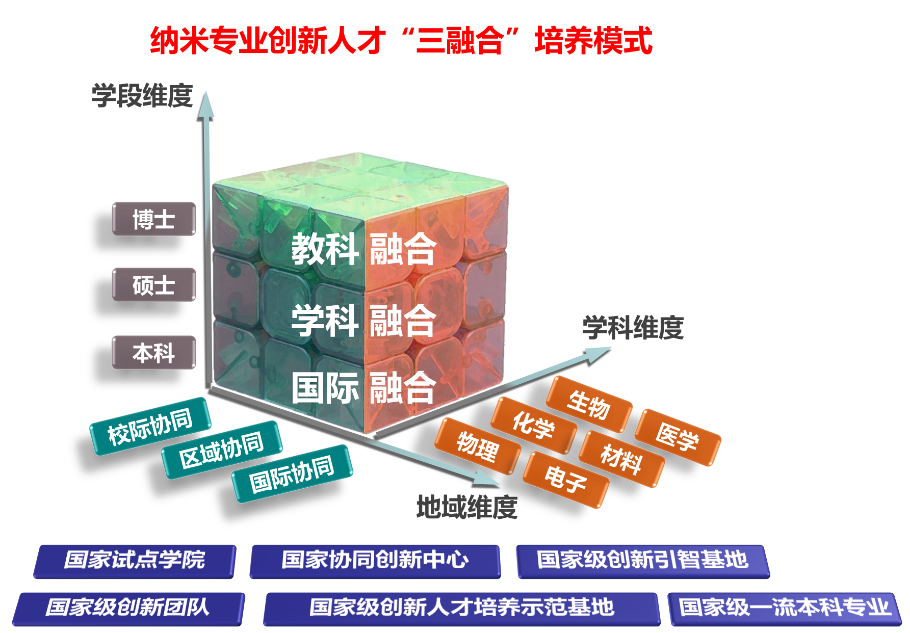 中心以“国家试点学院”苏州大学纳米科学技术学院为主体,联合各协同单位共建“苏州联合纳米学院”,构建了立足“教科融合、学科融合、国际融合”的纳米科技创新人才“三融合”培养模式,实现了师资共享、课程共享、协同育人,为区域纳米产业的发展输送了高质量的人才队伍。同时,充分发挥国家试点学院政策优势,率先推进本硕博一体化人才培养改革,推行全员导师制和专业课程全英文教学。